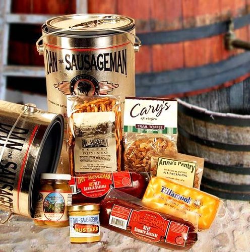 Alot of good stuff here! This cool collectors paint can is filled with cheese, pretzels, mustard's, sausage and more. Great gift for anyone anytime of the year!